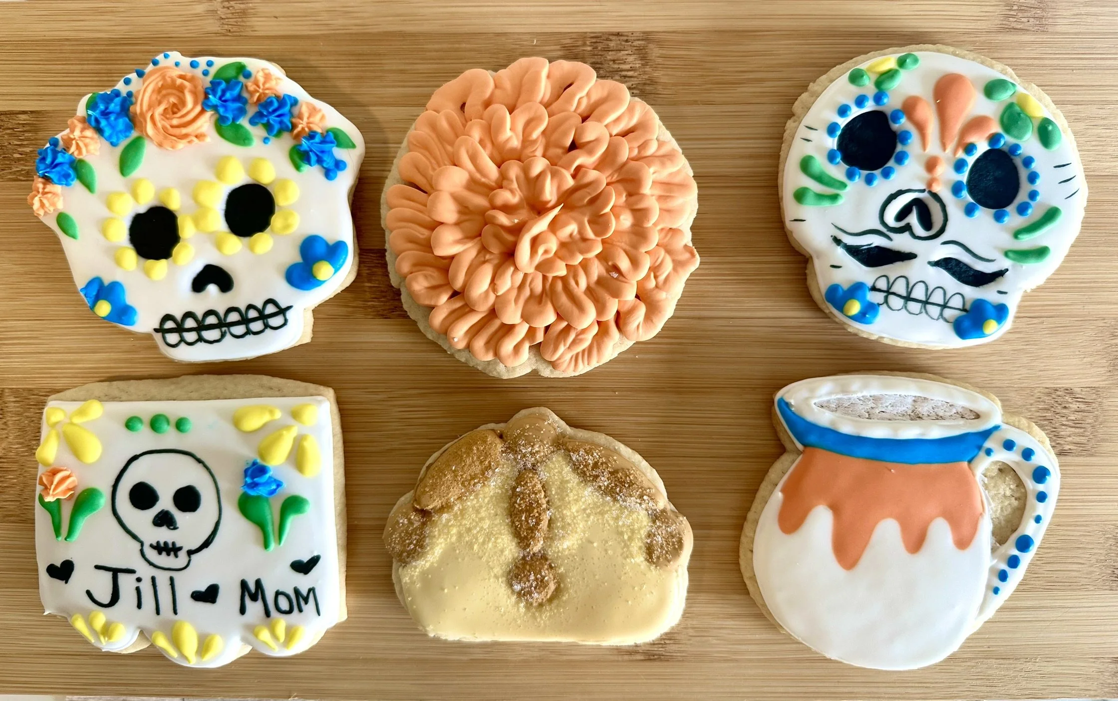 Next, you’ll decorate 6 Dia de Los Muertos themed sugar cookies—with one being decorated as a tribute to a loved one. Rosettes, icing and cookies will all be provided.